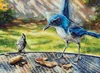 Peanut Brunch with Oak Tit & Scrub JayCommissioned watercolor portrait of two wild birds enjoying peanuts together. Moment created for the sake of the painting, since usually they are not seen this close together. Original 9”x12” watercolor.